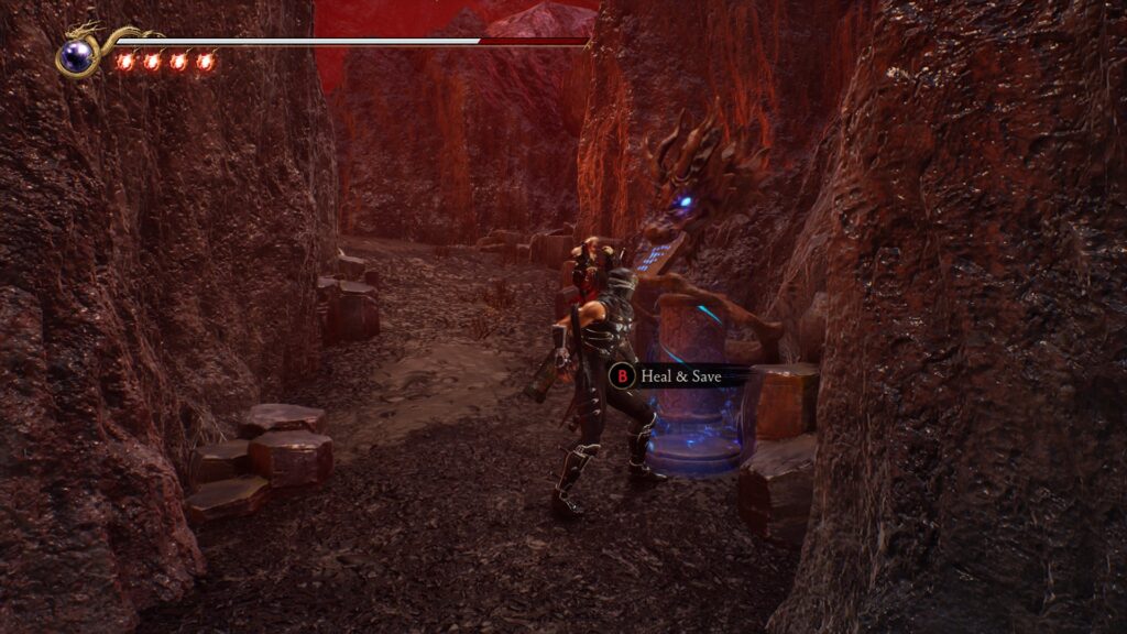 Bem, você já deve ter percebido que a cada porrada que você toma, perde-se uma parte da vida, normal né? NÃO, uma parte do que você perdeu de vida se perde permanentemente, ou até o jogador achar um totem desses ou um orbe azul que recupera a parte vermelha da vida perdida.